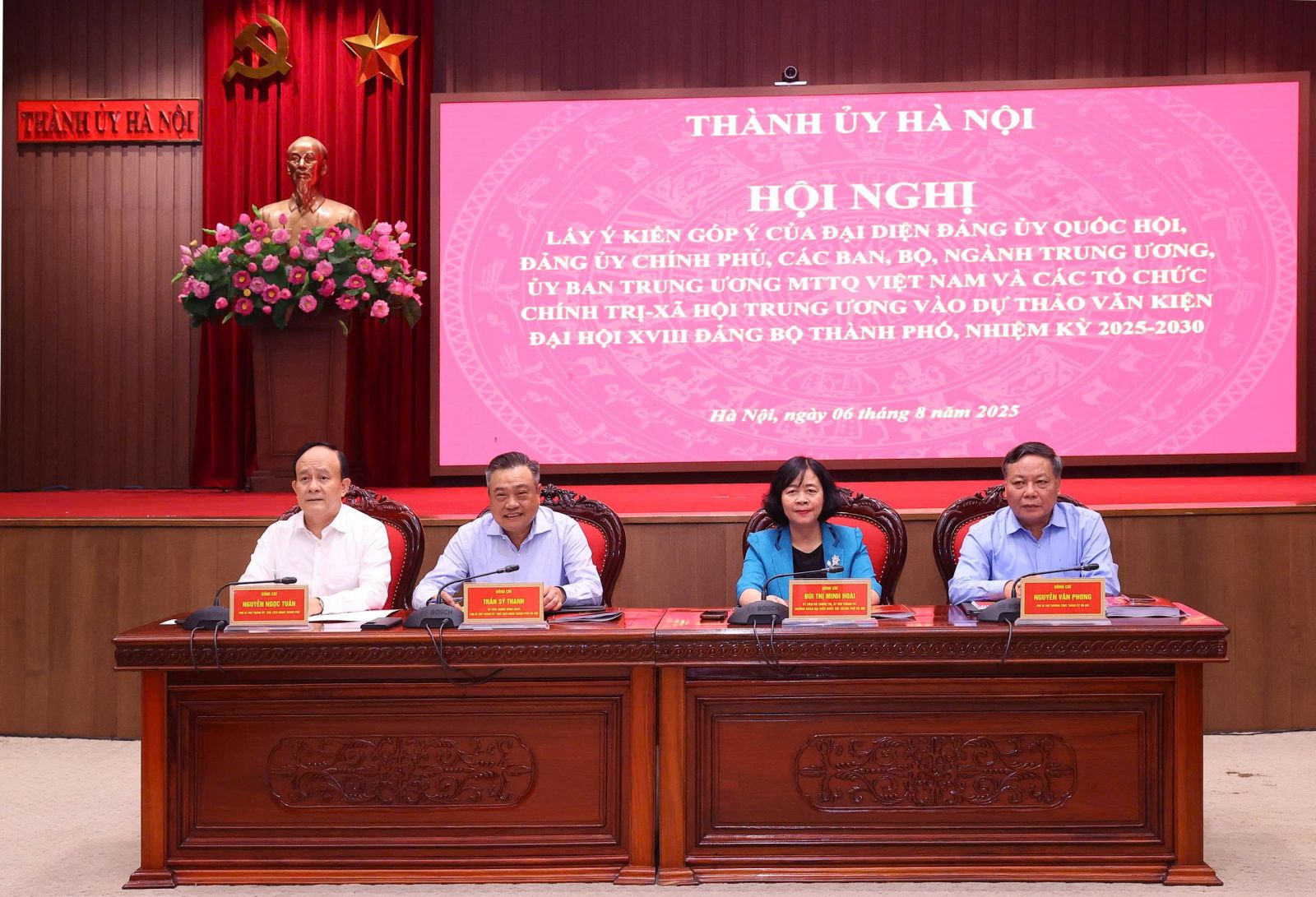 Chủ trì hội nghị có các đồng chí: Ủy viên Bộ Chính trị, Bí thư Thành ủy, Trưởng đoàn đại biểu Quốc hội thành phố Bùi Thị Minh Hoài; Ủy viên Trung ương Đảng, Phó Bí thư Thành ủy, Chủ tịch UBND thành phố Trần Sỹ Thanh; Phó Bí thư Thường trực Thành ủy Nguyễn Văn Phong; Phó Bí thư Thành ủy, Chủ tịch HĐND thành phố, Phó Trưởng đoàn đại biểu Quốc hội thành phố Nguyễn Ngọc Tuấn.