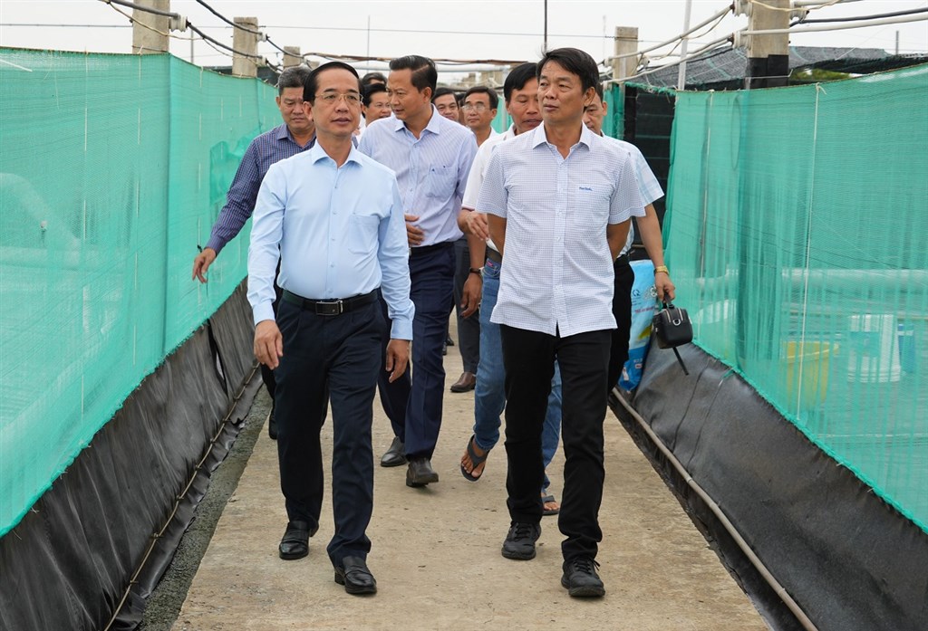 Đoàn công tác tham quan mô hình nuôi tôm siêu thâm canh trên địa bàn xã Vĩnh Hậu.