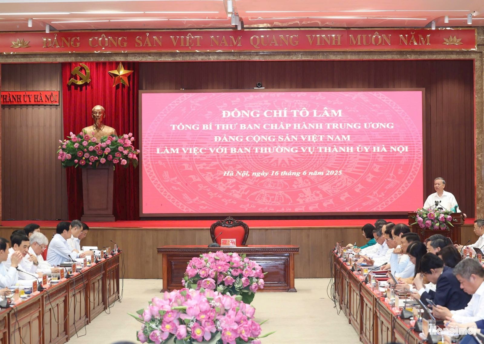 Tổng Bí thư Tô Lâm làm việc với Ban Thường vụ Thành ủy Hà Nội về tình hình, kết quả thực hiện các kết luận, nghị quyết của Trung ương, việc sắp xếp đơn vị hành chính ngày 16/6. (Ảnh: Hanoimoi)