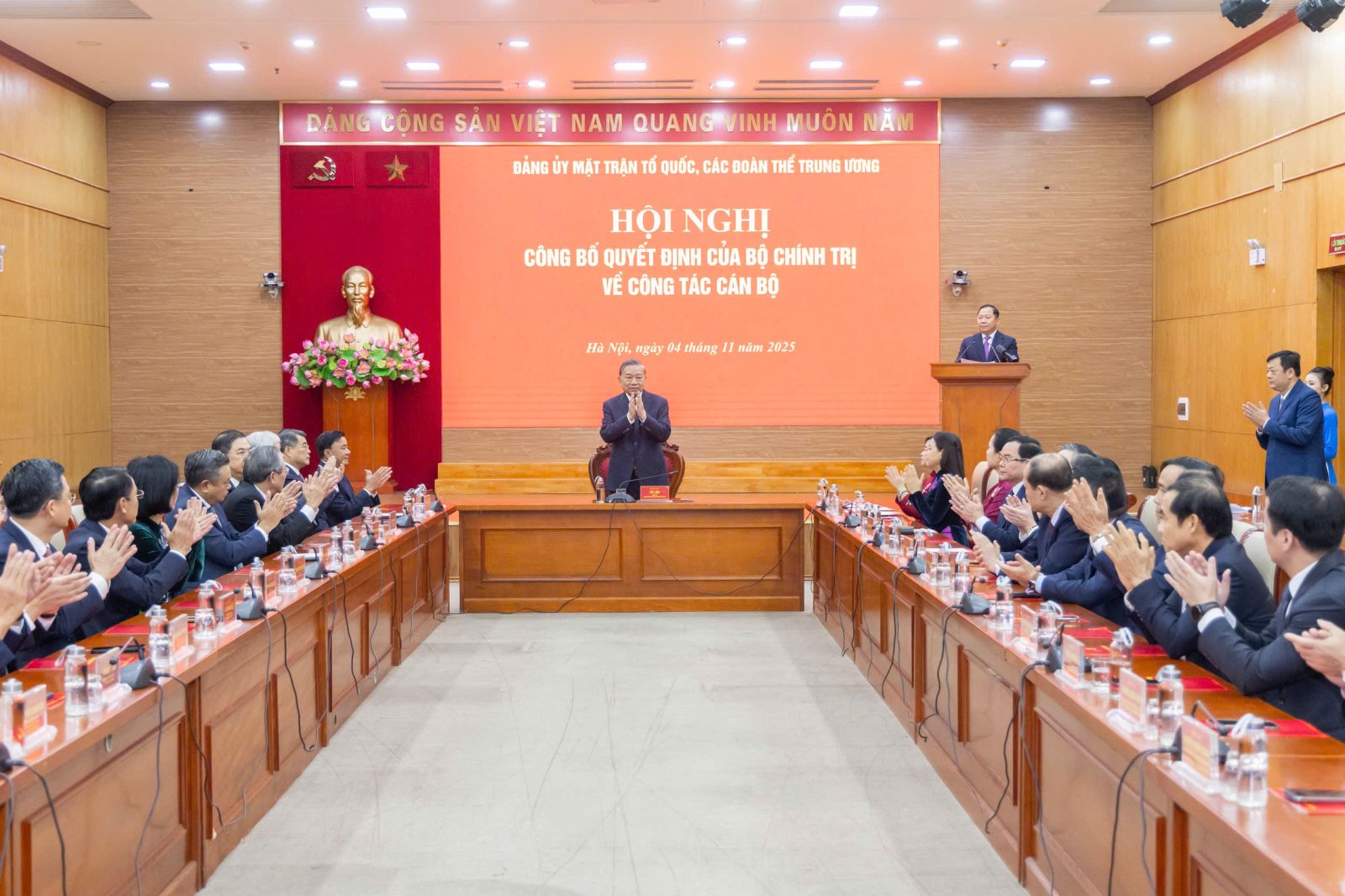 (ĐCSVN) - Sáng 4/11, tại Hà Nội, Đảng ủy MTTQ, các đoàn thể Trung ương tổ chức Hội nghị công bố quyết định của Bộ Chính trị về công tác cán bộ. Tổng Bí thư Tô Lâm dự và phát biểu tại Hội nghị.