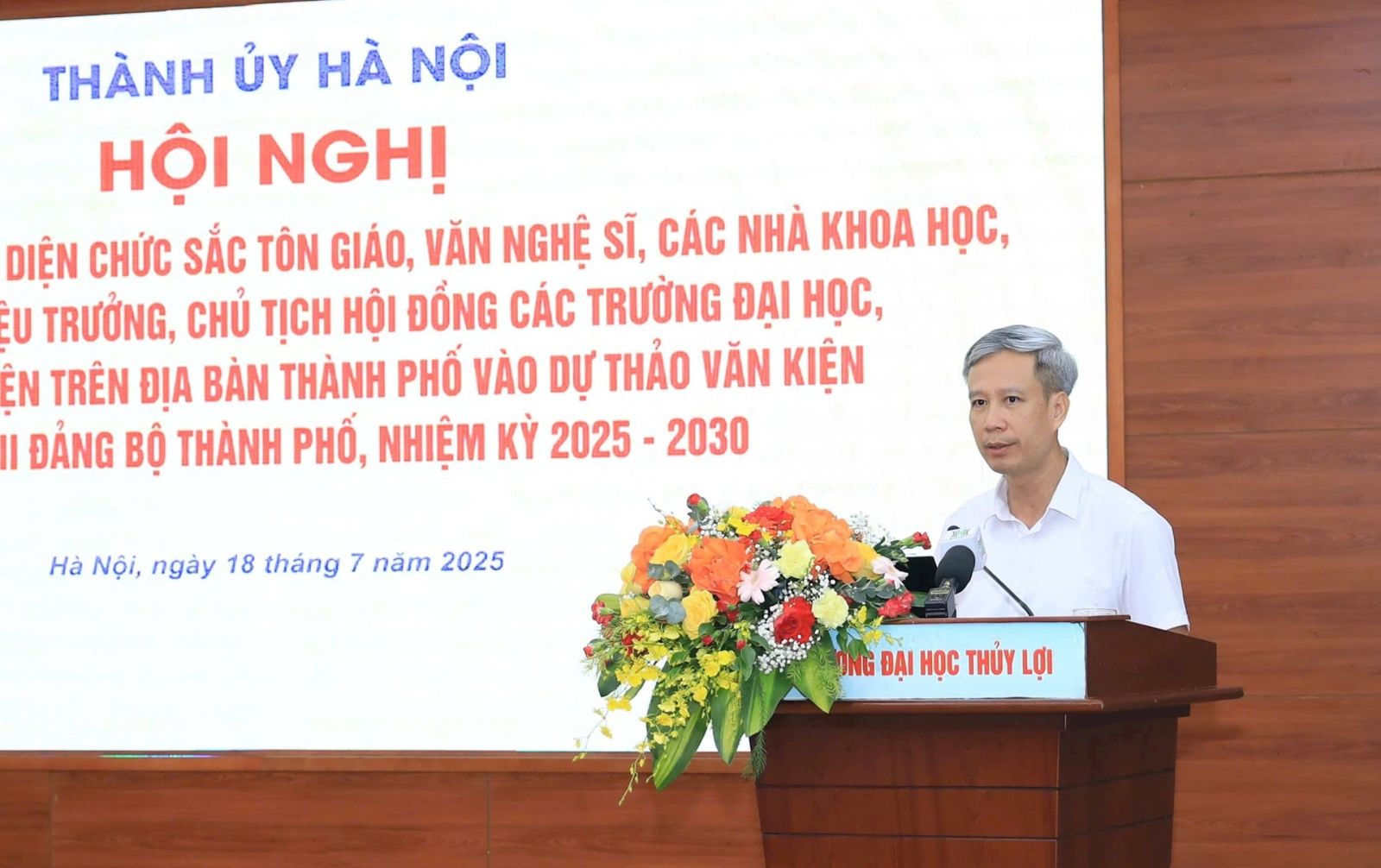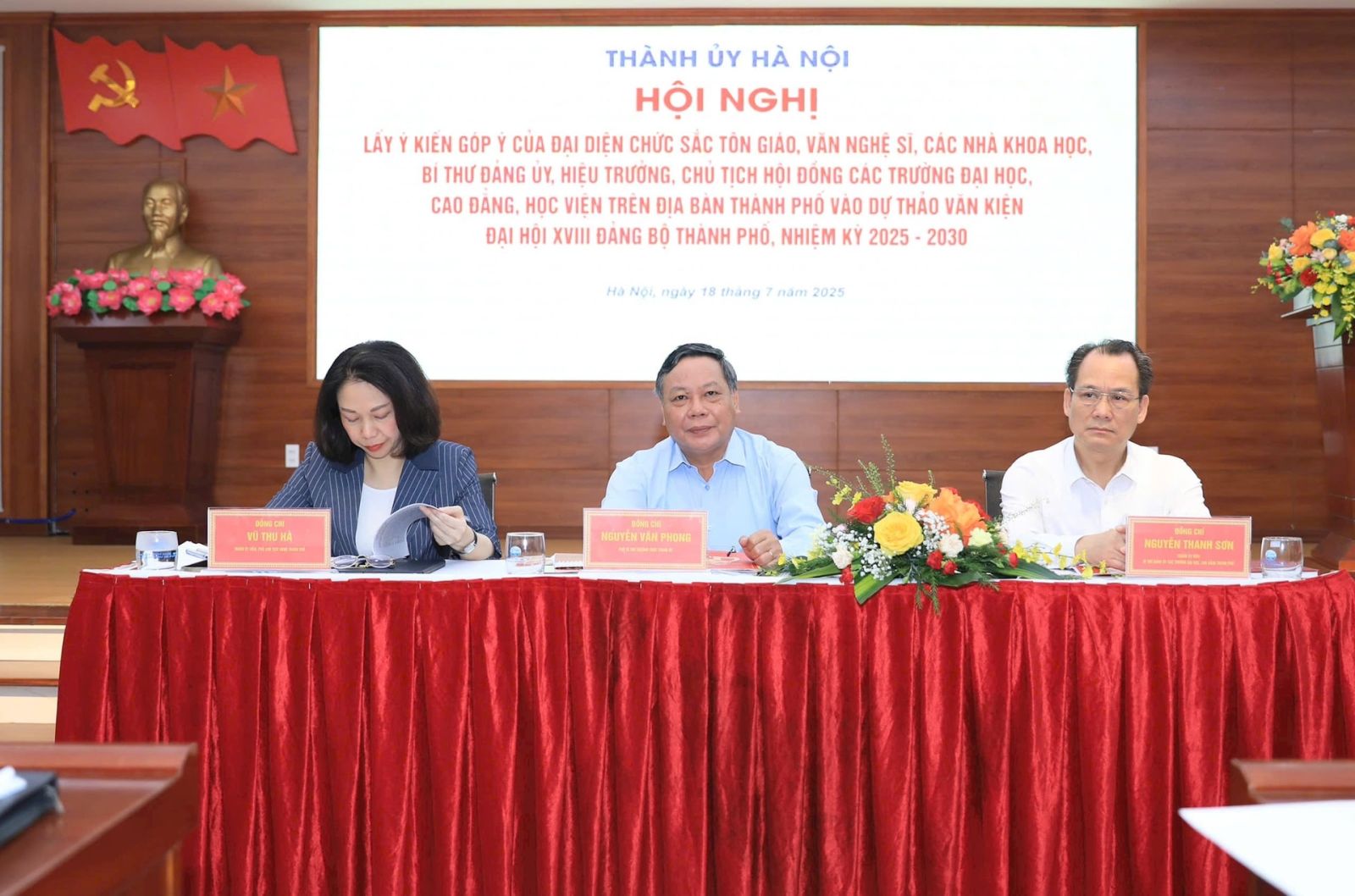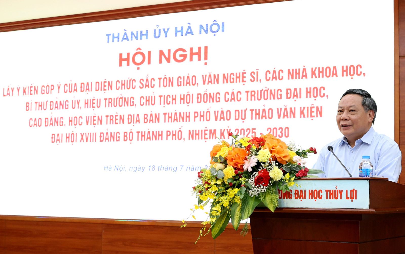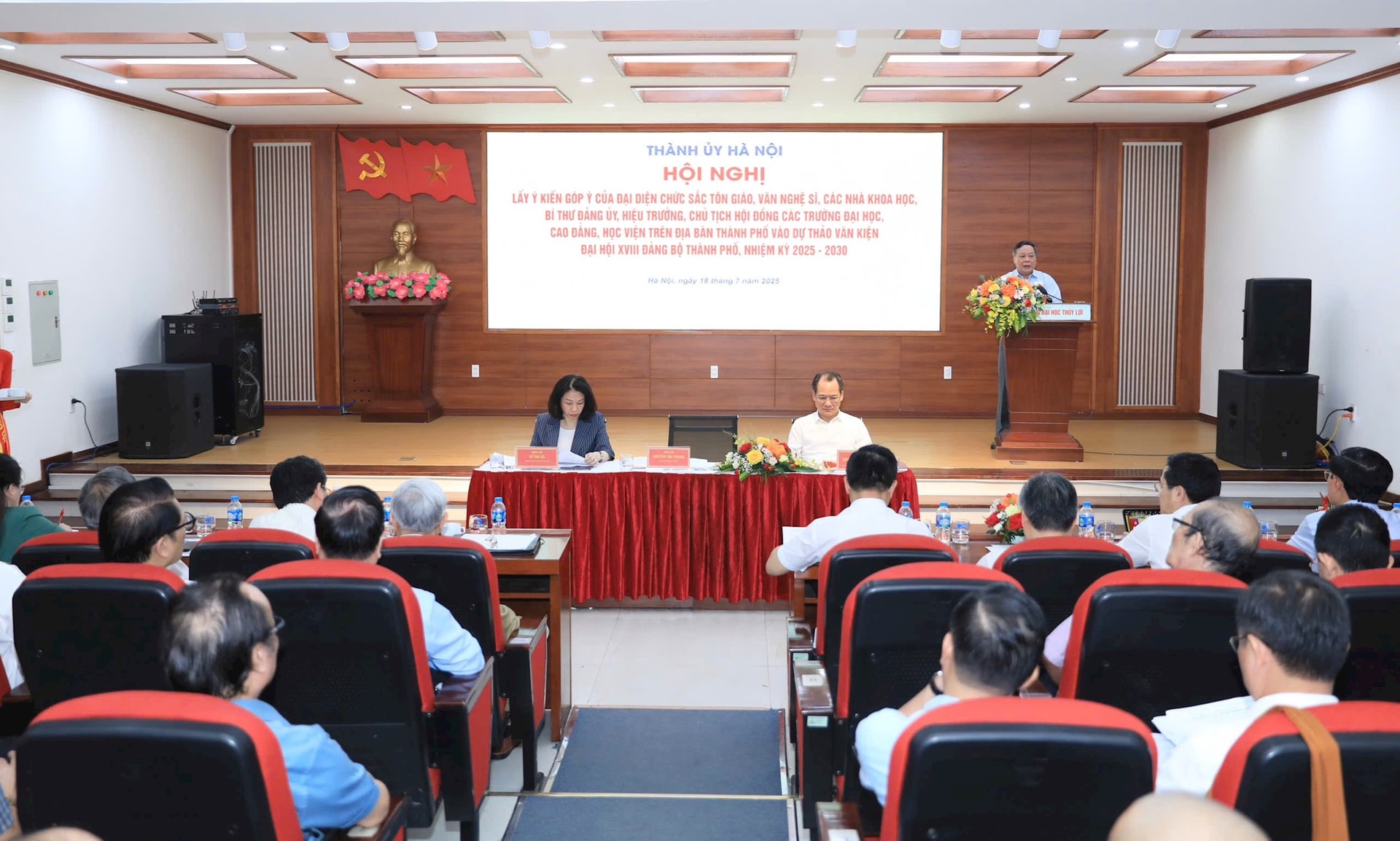 (ĐCSVN) - Sáng 18/7, Thành uỷ Hà Nội tổ chức Hội nghị lấy ý kiến góp ý của đại diện chức sắc, tôn giáo, văn nghệ sĩ, các nhà khoa học, bí thư đảng uỷ, hiệu trưởng, chủ tịch hội đồng các trường đại học, cao đẳng, học viện trên địa bàn Thành phố vào dự thảo Văn kiện Đại hội XVIII Đảng bộ Thành phố, nhiệm kỳ 2025-2030.