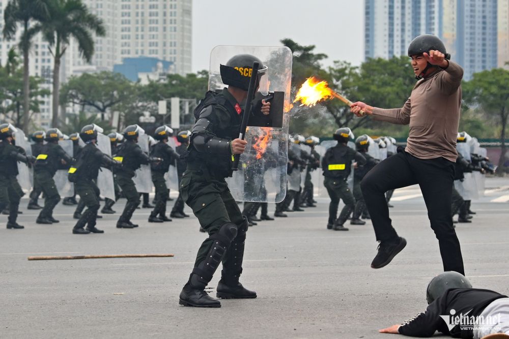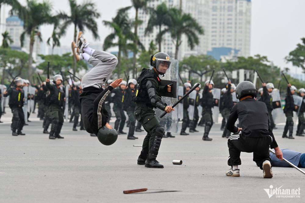 Sau màn diễu hành, các lực lượng Công an cùng phối hợp thực hiện diễn tập phương án chống bạo loạn và bảo vệ an ninh, trật tự cho Đại hội Đảng.