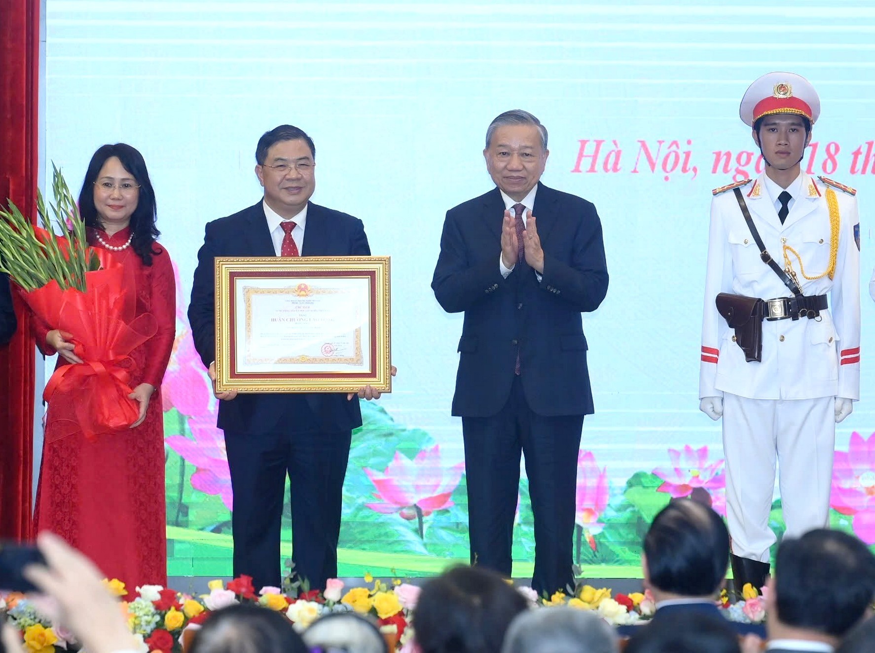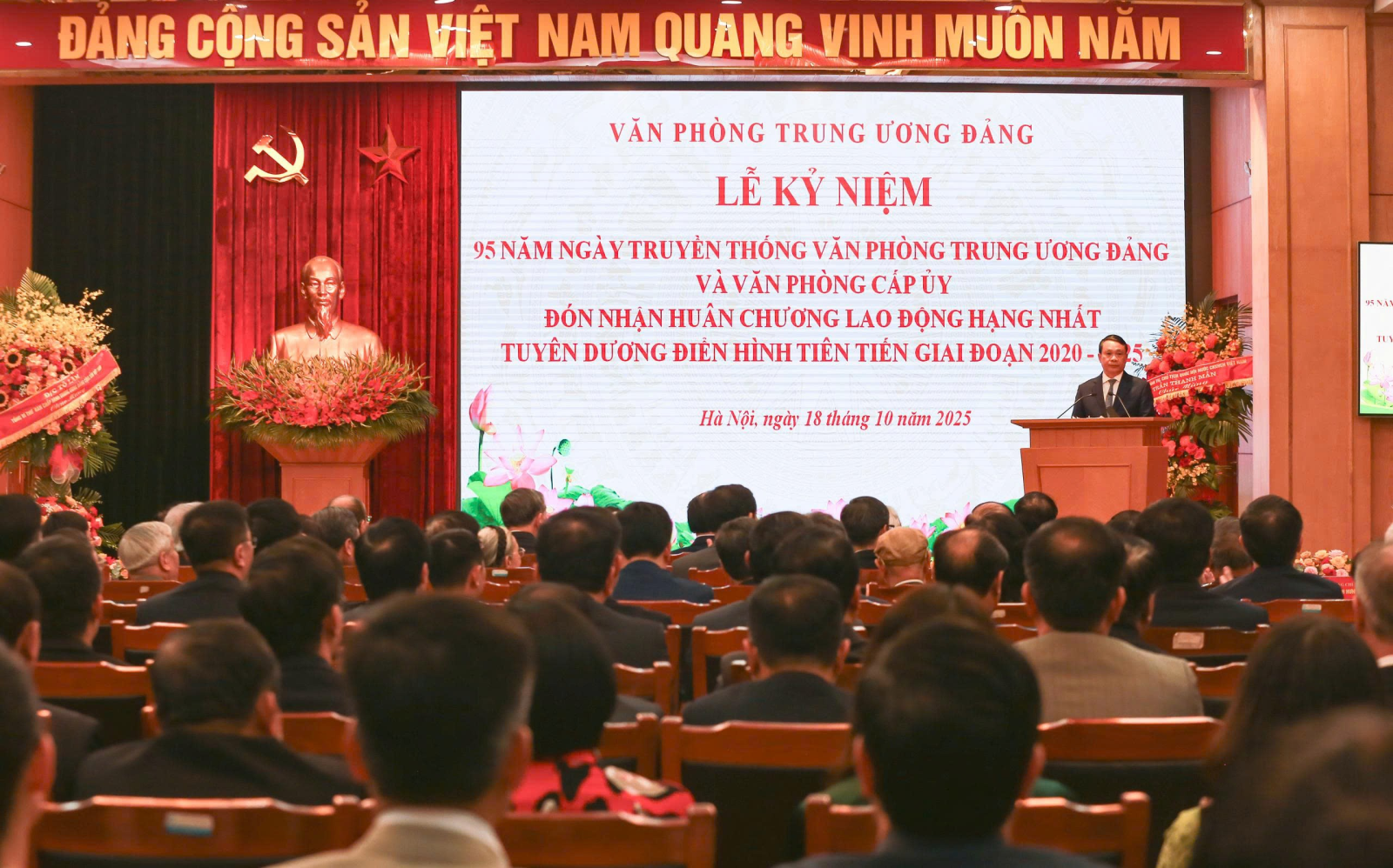 (ĐCSVN) – Chiều 18/10, tại Hà Nội, Văn phòng Trung ương Đảng đã tổ chức trọng thể Lễ kỷ niệm 95 năm Ngày truyền thống Văn phòng Trung ương Đảng và Văn phòng cấp ủy; đón nhận Huân chương Lao động hạng Nhất và tuyên dương các điển hình tiên tiến giai đoạn 2020-2025. Tổng Bí thư Tô Lâm dự và chỉ đạo buổi Lễ.