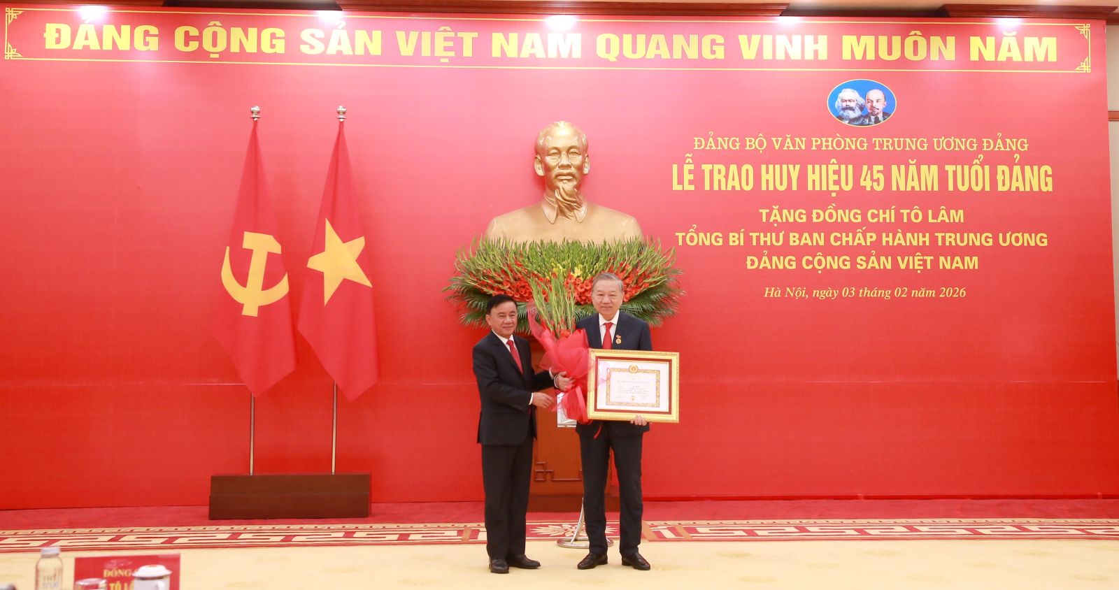 (ĐCSVN) - Kỷ niệm 96 năm Ngày thành lập Đảng Cộng sản Việt Nam (3/2/1930 - 3/2/2026), sáng 3/2, tại Trụ sở Trung ương Đảng, Đảng ủy Văn phòng Trung ương Đảng đã tổ chức Lễ trao Huy hiệu 45 năm tuổi Đảng tặng đồng chí Tô Lâm, Tổng Bí thư Ban Chấp hành Trung ương Đảng Cộng sản Việt Nam.