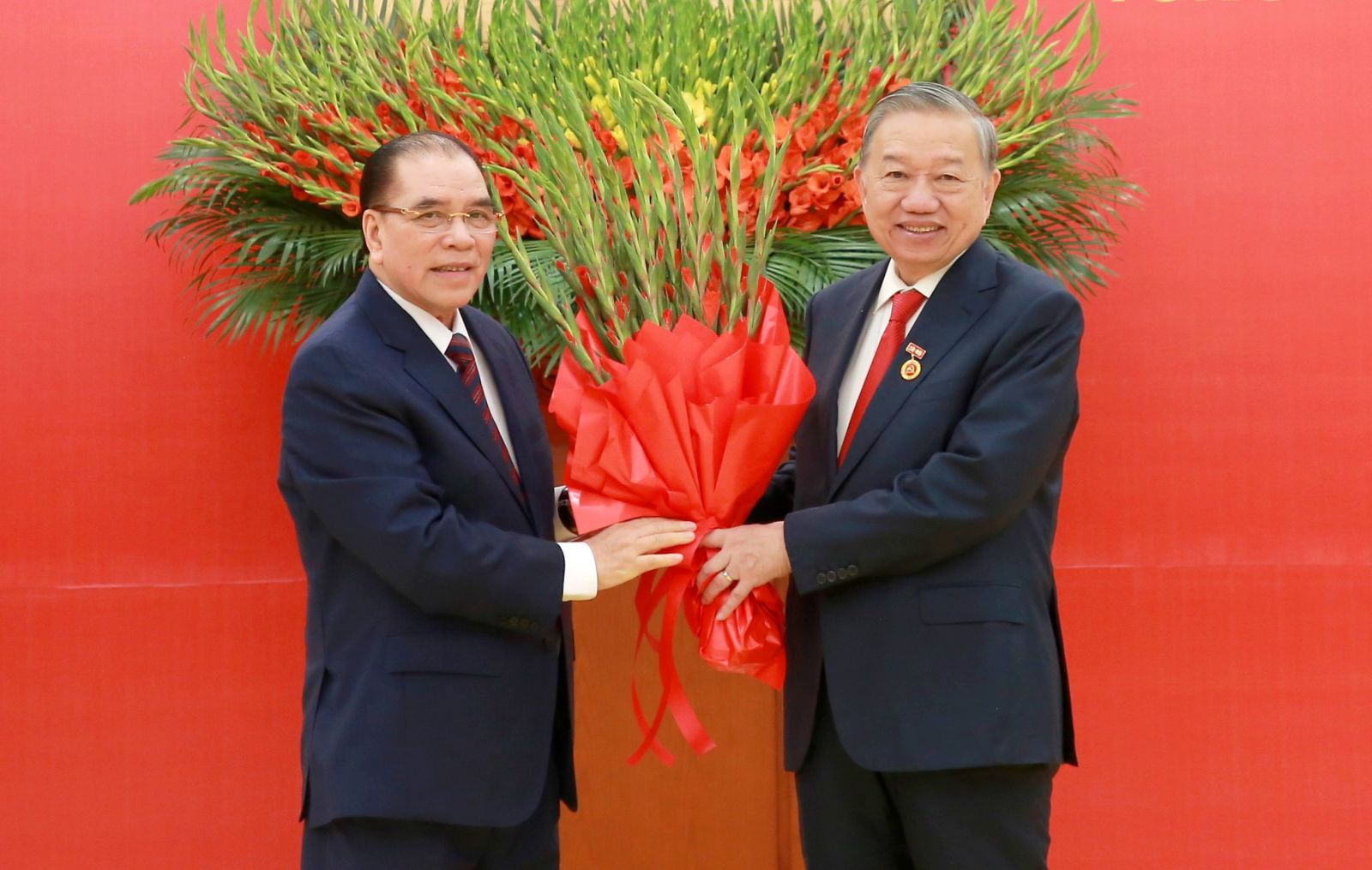 Thay mặt lãnh đạo Đảng, đồng chí Trần Cẩm Tú, Thường trực Ban Bí thư đã trân trọng trao Huy hiệu 45 năm tuổi Đảng và tặng hoa chúc mừng đồng chí Tô Lâm, Tổng Bí thư Ban Chấp hành Trung ương Đảng Cộng sản Việt Nam.