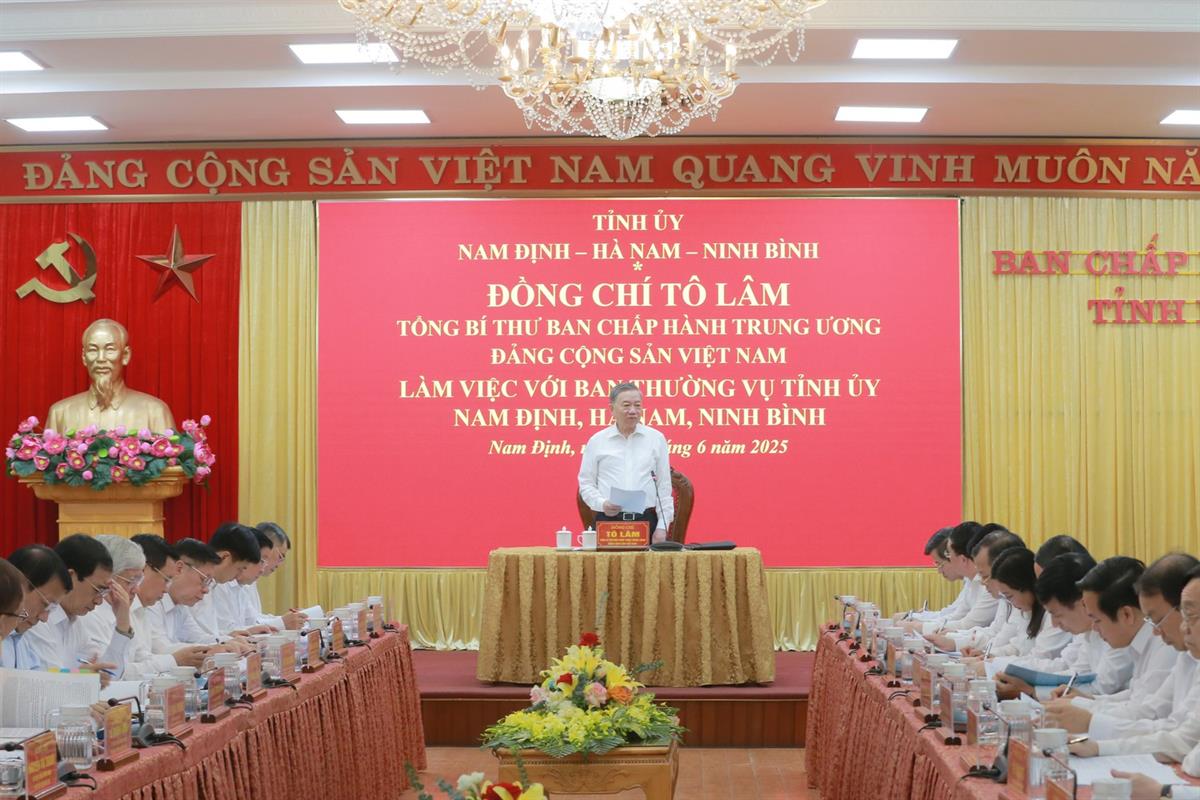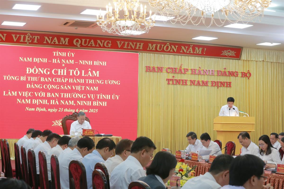 Chiều 23/6, Tổng Bí thư Tô Lâm và đoàn công tác Trung ương đã có buổi làm việc với Ban Thường vụ Tỉnh ủy Ninh Bình, Nam Định, Hà Nam.