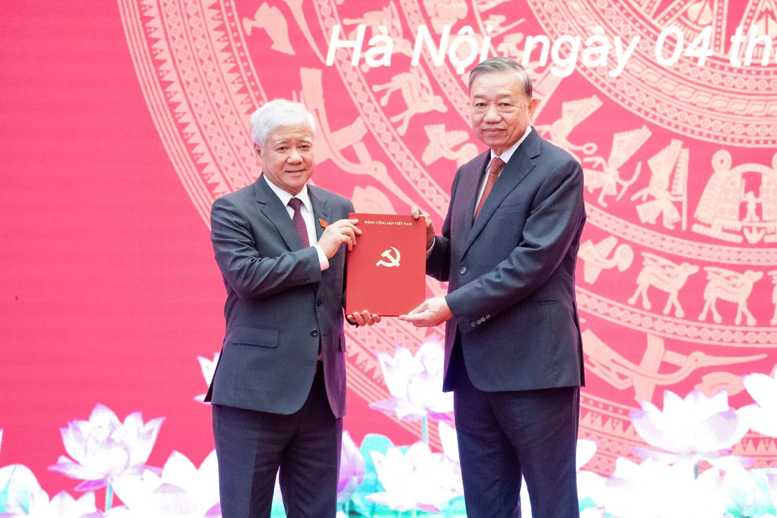Thay mặt Bộ Chính trị, Tổng Bí thư Tô Lâm đã trao quyết định, tặng hoa chúc mừng đồng chí Đỗ Văn Chiến.