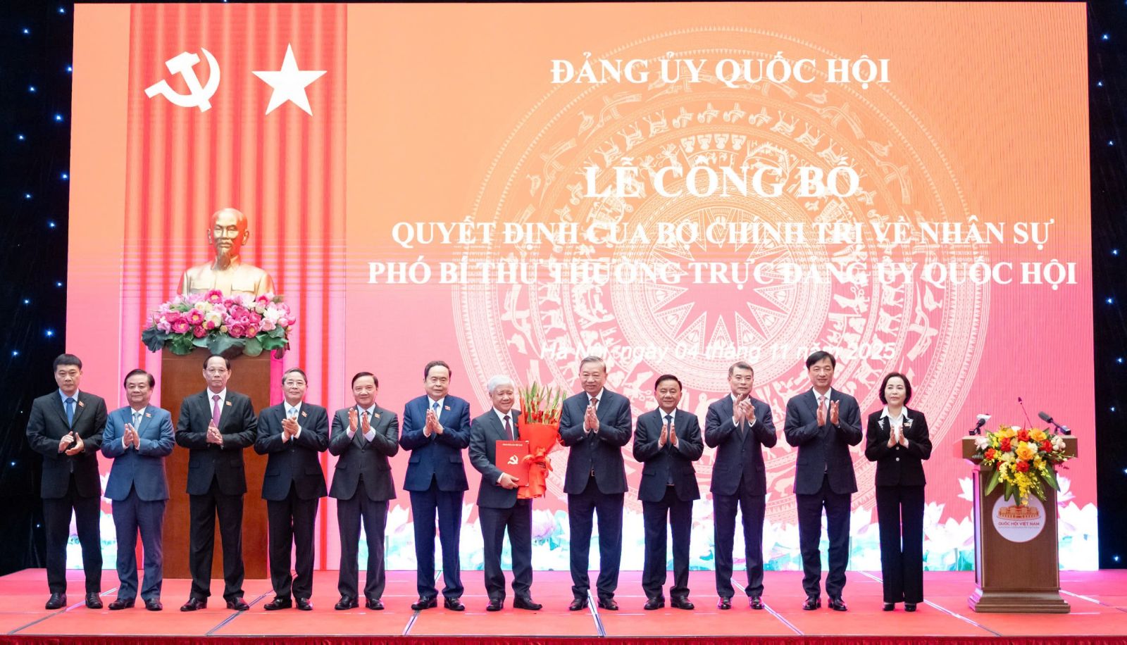 (ĐCSVN) - Sáng 4/11, tại Nhà Quốc hội, Đảng ủy Quốc hội tổ chức Lễ công bố Quyết định của Bộ Chính trị về nhân sự Phó Bí thư Thường trực Đảng ủy Quốc hội. Tổng Bí thư Tô Lâm dự và trao Quyết định.