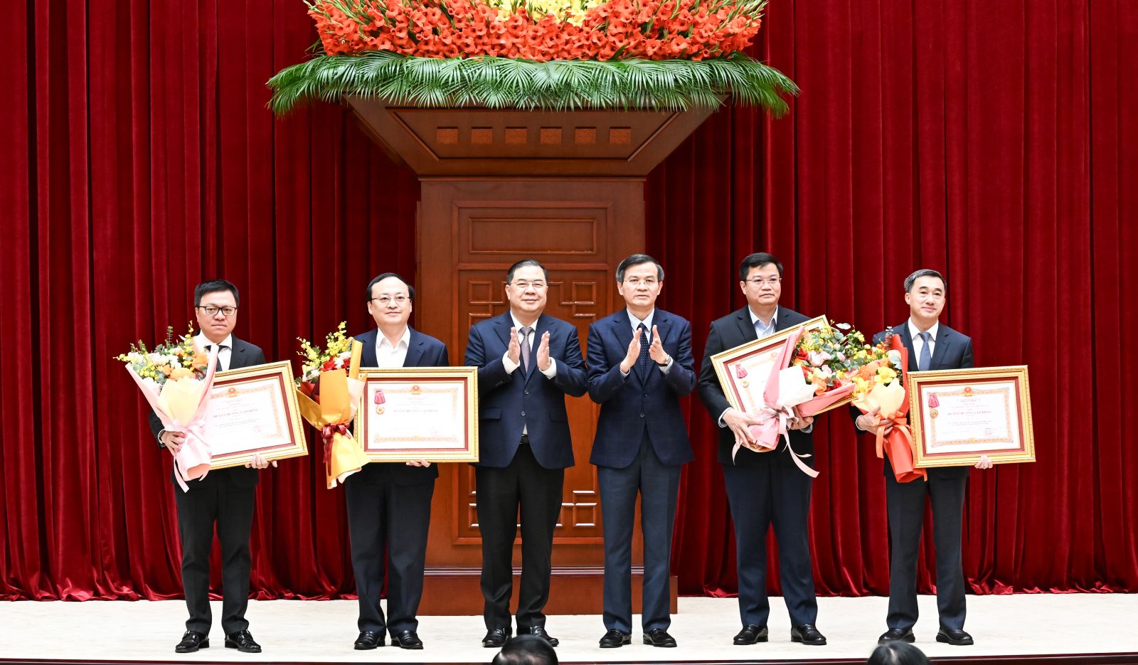 Chánh Văn phòng Trung ương Đảng Phạm Gia Túc và Giám đốc Học viện Chính trị Quốc gia Hồ Chí Minh Đoàn Minh Huấn trao Huân chương Lao động hạng Ba tặng các cơ quan có thành tích xuất sắc, đột xuất trong công tác tham mưu, tổ chức, phục vụ Đại hội XIV của Đảng.