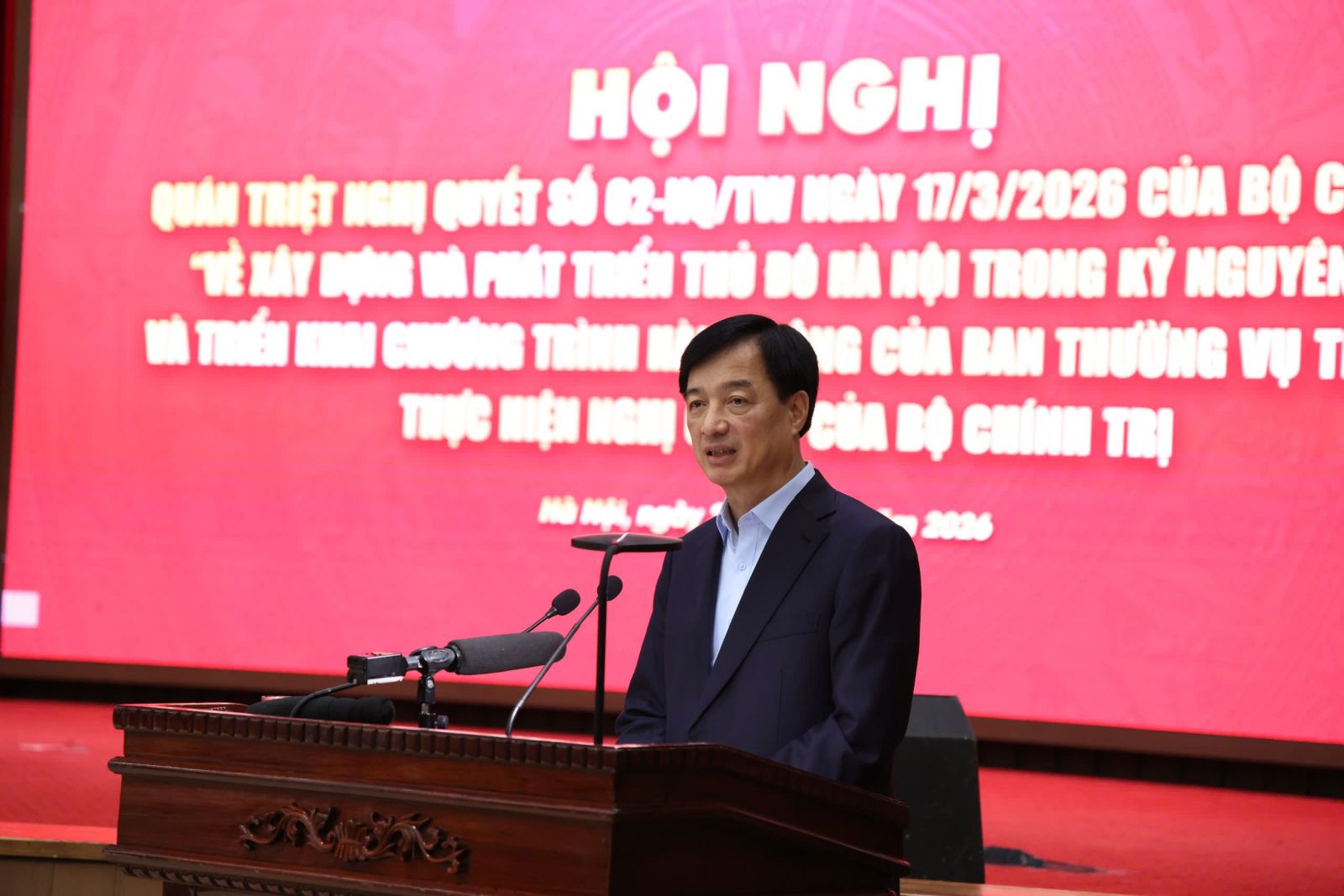 (ĐCSVN) - Sáng 26/3, Thành ủy Hà Nội tổ chức hội nghị quán triệt Nghị quyết số 02-NQ/TW ngày 17/3/2026 của Bộ Chính trị về "Xây dựng và phát triển Thủ đô Hà Nội trong kỷ nguyên mới” và triển khai Chương trình hành động của Ban Thường vụ Thành ủy thực hiện Nghị quyết của Bộ Chính trị.