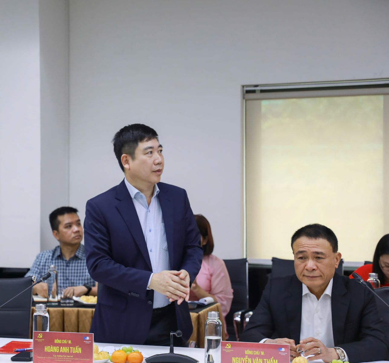 Về phía Việt Nam có các đồng chí: Nguyễn Văn Thẩm, Cục trưởng Cục Quản trị, đại diện nhà đầu tư; Hoàng Anh Tuấn, Cục trưởng Cục Lưu trữ; cùng các chuyên gia, nhà khoa học trong lĩnh vực bảo tàng, lịch sử, lưu trữ.