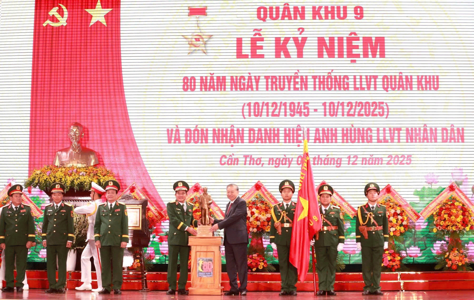 Phát biểu chỉ đạo tại Lễ Kỷ niệm 80 năm ngày truyền thống Lực lượng vũ trang (LLVT) Quân khu 9 (10/12/1945 - 10/12/2025) và đón nhận danh hiệu Đơn vị Anh hùng Lực lượng vũ trang Nhân dân, sáng 8/12, thay mặt lãnh đạo Đảng, Nhà nước, Quân ủy Trung ương, Tổng Bí thư Tô Lâm, Bí thư Quân ủy Trung ương gửi tới các đồng chí lãnh đạo, nguyên lãnh đạo Đảng, Nhà nước, các cơ quan Trung ương; Quân ủy Trung ương, Bộ Quốc phòng, lãnh đạo các tỉnh, thành phố trên địa bàn Quân khu 9; các Mẹ Việt Nam Anh hùng, Anh hùng Lực lượng vũ trang Nhân dân, các tướng lĩnh, sỹ quan, cựu chiến binh, các đồng chí thương binh, gia đình liệt sỹ, gia đình có công với cách mạng, gia đình chính sách cùng toàn thể cán bộ, nhân viên, chiến sĩ, dân quân tự vệ, người lao động của Quân khu 9 qua các thời kỳ những tình cảm sâu sắc và lời chúc mừng tốt đẹp nhất.